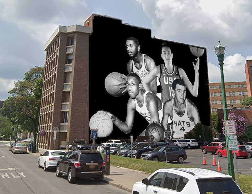 The six-story mural will feature four of the city’s most significant basketball stars: Breanna Stewart, Earl Lloyd Jr., Dolph Schayes, and Manny Breland.