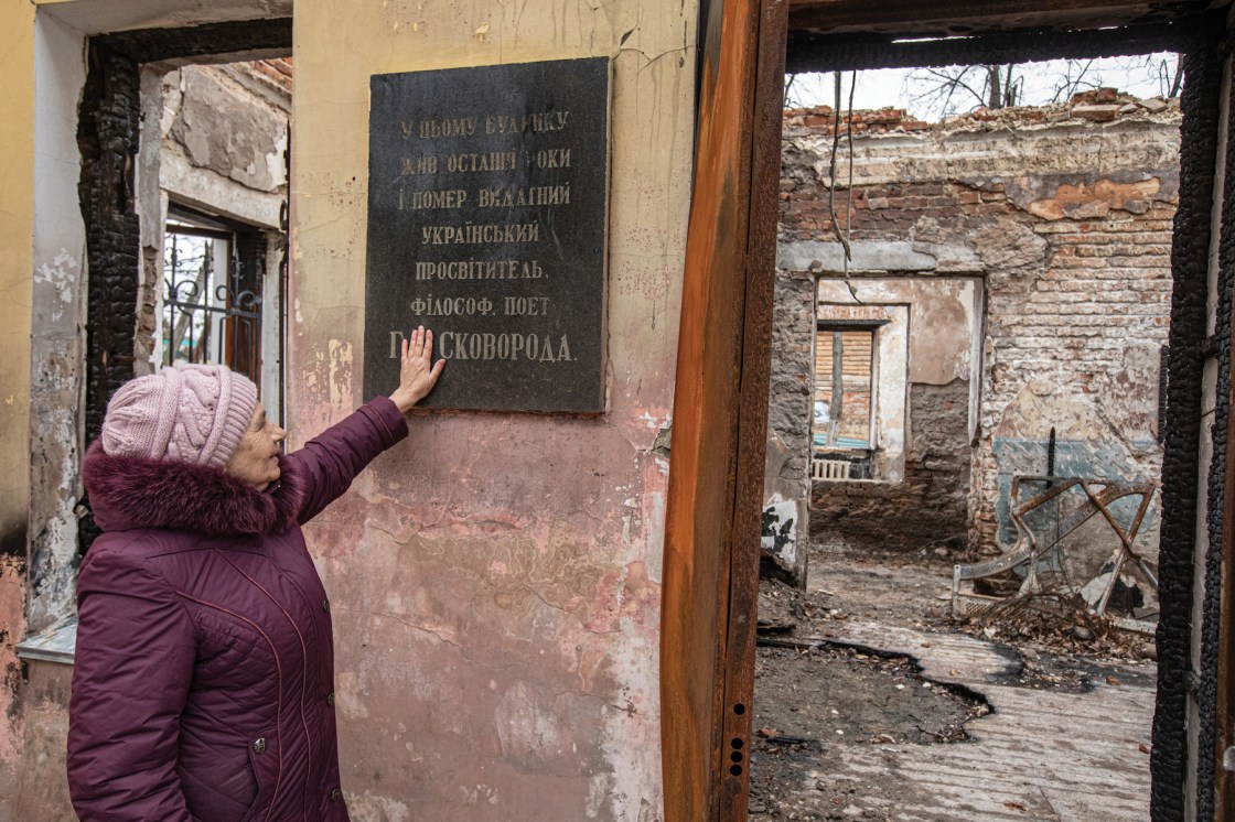 Only the battered and charred walls of the Hryhoriy Skovoroda National Literary and Memorial Museum remain standing, like ribs surrounding a chest cavity, void of the heart and lungs that once beat and breathed life.